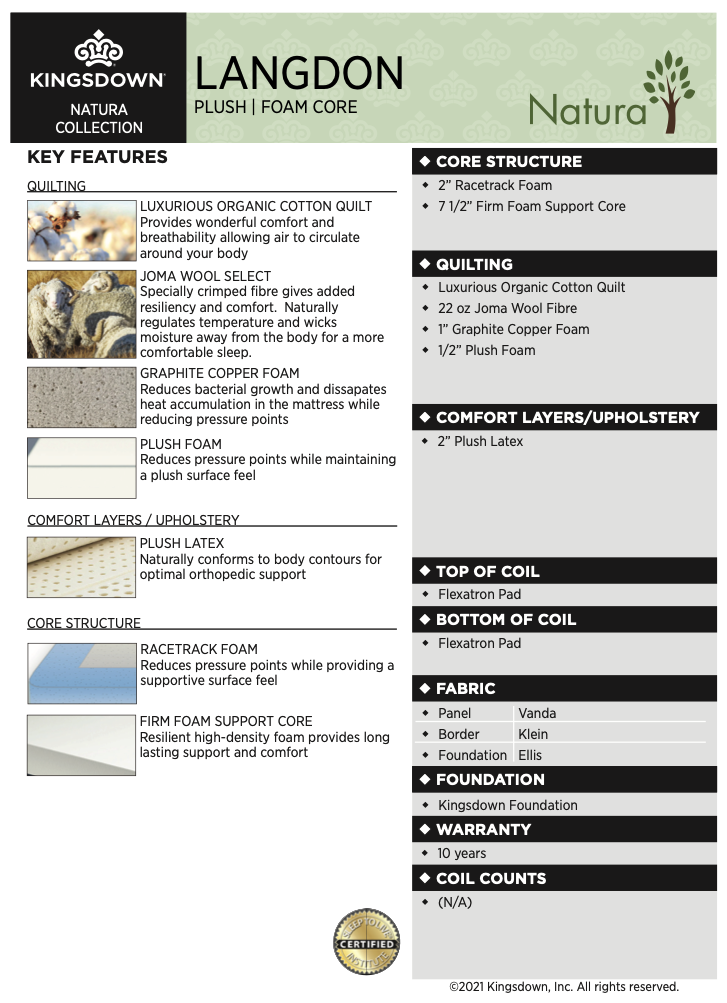 The Langdon Plush Mattress from the Natura Collection offers a premium sleep experience designed for deep comfort and long-lasting support. Built with breathable organic materials and advanced foam technologies, this mattress gently conforms to your body while keeping you cool and supported throughout the night. Layers of plush latex, graphite copper foam, and Joma wool work in harmony to relieve pressure points and regulate temperature, making the Langdon ideal for those who value both comfort and sustainability.