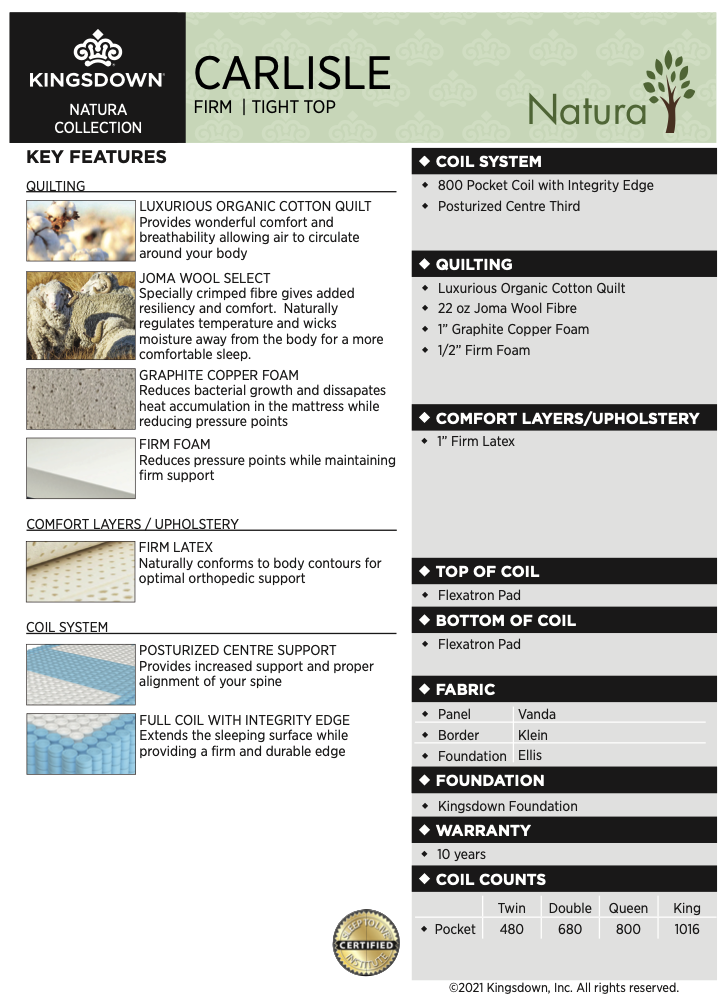 The Carlisle Firm Mattress from the Natura Collection is built for firm, restorative sleep with targeted support where you need it most. Featuring a precision-engineered pocket coil system and sustainable natural materials, this mattress delivers orthopedic firmness without sacrificing comfort. Layers of firm latex, graphite copper foam, and breathable Joma wool work together to regulate temperature and relieve pressure points, while the reinforced posturized center ensures optimal spinal alignment all night long.